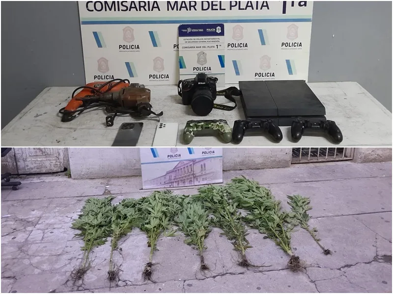 En el lugar se secuestró una cámara fotográfica profesional Nikon D, una consola Sony PlayStation 4, tres joysticks y dos agujereadoras marca Black & Decker, todos elementos denunciados como robados por la víctima. Además, se incautaron siete plantas de marihuana con un peso total de 2,375 kilos y dos teléfonos celulares, un TCL y un Samsung, que serán sometidos a pericias informáticas por su presunto uso en actividades delictivas.