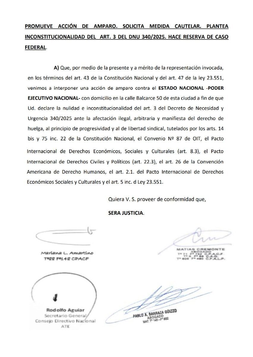 La Asociación Trabajadores del Estado (ATE) presentó este jueves un recurso de amparo ante el Juzgado Nacional de Primera Instancia del Trabajo N° 20, con el objetivo de que se declare la inconstitucionalidad del Decreto de Necesidad y Urgencia (DNU) 340/25, impulsado por el Gobierno Nacional. La organización sindical también solicitó una medida cautelar para suspender de manera inmediata los efectos del decreto mientras dure el proceso judicial.