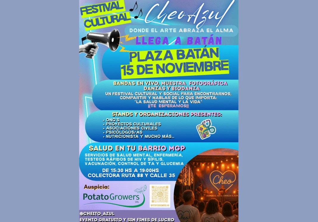 El sábado 15 de noviembre, la Plaza Batán será escenario del Festival Cultural “Cheoazul”, un encuentro solidario y sin fines de lucro que propone hablar de salud mental desde el arte, el movimiento y la comunidad.