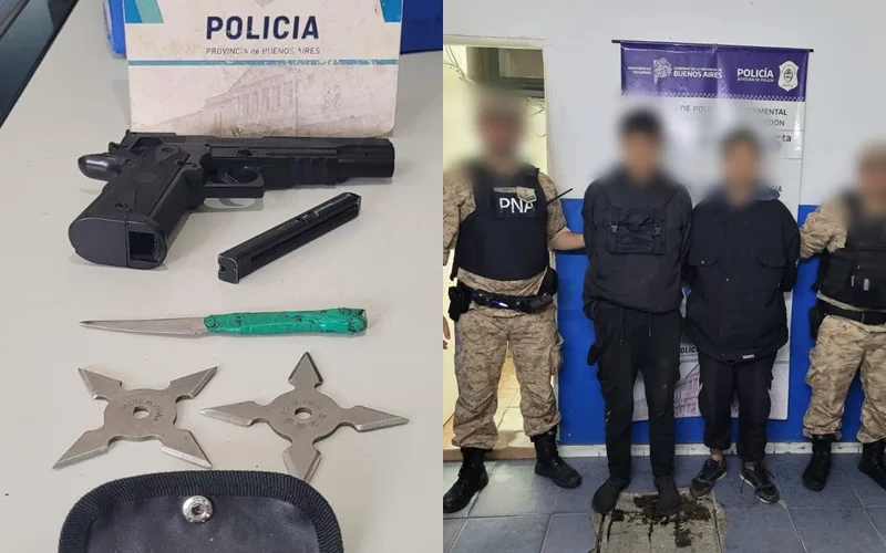 Durante la corrida, el imputado de 30 años arrojó hacia el interior de una vivienda una réplica de arma de fuego de color negro. Tras ser alcanzados, el personal realizó un cacheo preventivo y encontró entre sus prendas dos estrellas tipo ninja y un cuchillo con mango verde. El otro involucrado, de 27 años, no tenía elementos vinculados al hecho.