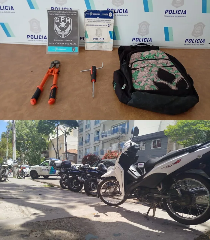 Según informaron fuentes policiales a Radio 10 Mar del Plata, los jóvenes intentaron escapar al notar la presencia de los efectivos, pero fueron alcanzados pocos metros después, en Arenales al 2635. Durante el procedimiento, uno de ellos arrojó una mochila negra con detalles en rosa, dentro de la cual se hallaron una “yuga” casera en forma de T y una pinza corta perno, elementos comúnmente utilizados para forzar sistemas de encendido.